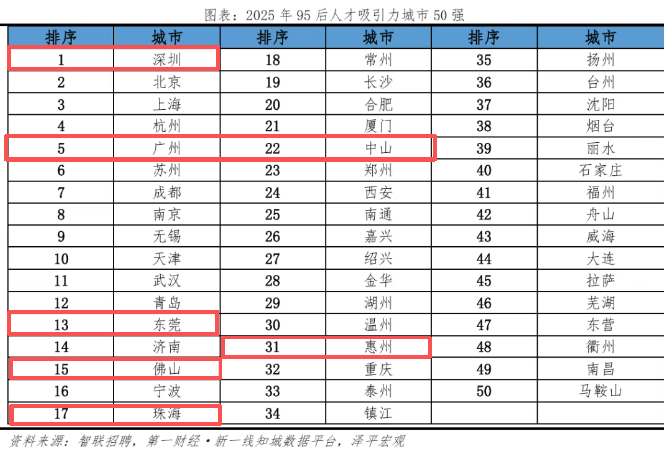 近日,智联招聘和泽平宏观联合推出的《中国城市人才吸引力排名》报告显示,深圳、广州对“95后”人才吸引力稳居全国前五,东莞、佛山、珠海、中山、惠州均在50强之列,彰显了广东对年轻人才的强劲吸引力。详情>>