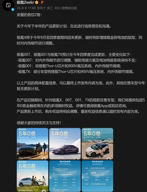 为平稳过渡产品切换期,极氪对现款车型推出限时权益:8 月 8 日 - 31 日购买四款车型,可享 5000 元保险补贴、5000 元限时补贴、5 年 0 息金融方案及 1.6 万元选装礼包。关于改款车型定价,业内推测 001 将维持高端定位,7X 或通过高低配区分拉低起售价至 21 万元左右,X 金砖电池版顶配可能超 18 万元,007 价格则微调。
