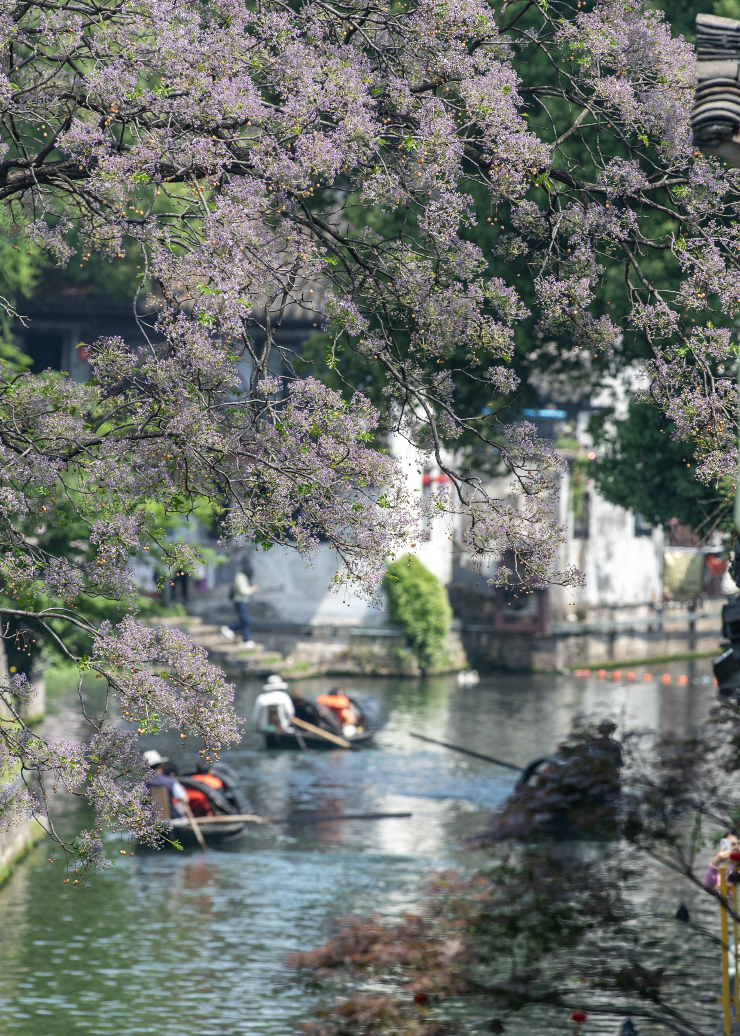 4月25日,游客在浙江省绍兴市越城区仓桥直街乘坐乌篷船游览古城。