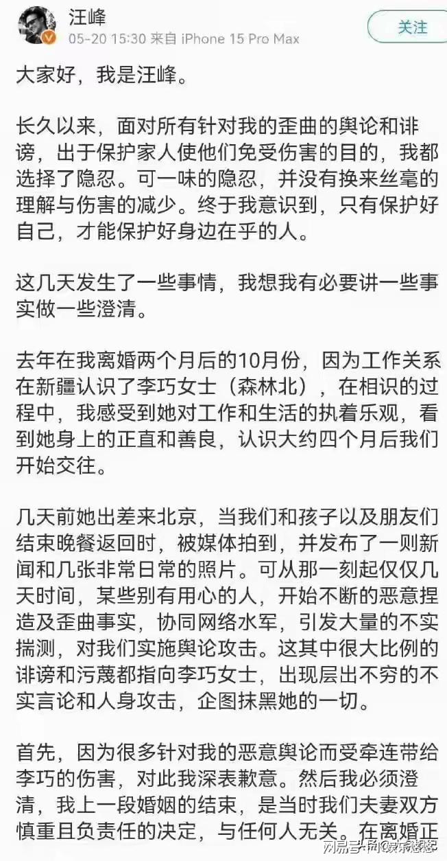 她估计是看汪峰和森林北秀恩爱破防了,转发的是汪峰官宣恋情时,他替自己和森林北澄清的那篇长文。当时好多人说他们两个是在他和章子怡没离婚时就在一起了,猜测两人一个婚内出轨,一个插足破坏别人婚姻。随后汪峰辟谣,称他和森林北是离婚两个月后才认识。