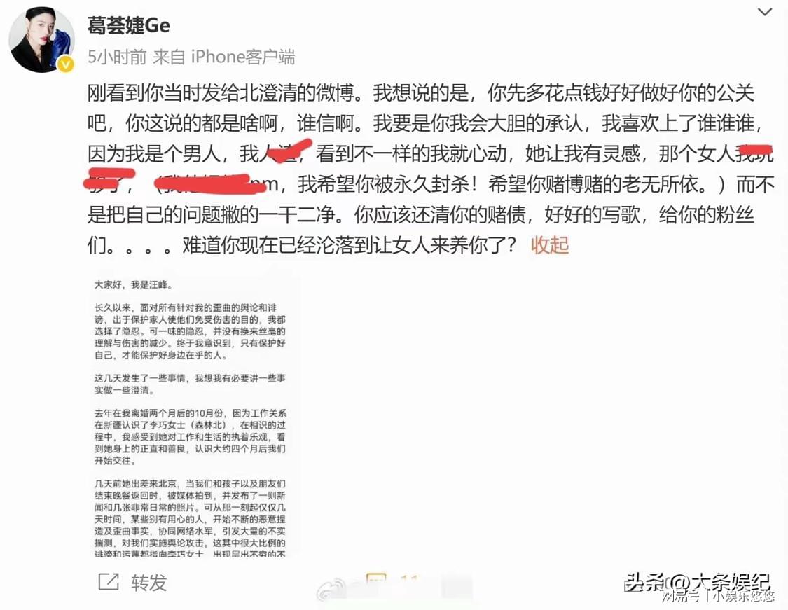葛荟婕凌晨发文怒斥汪峰,让汪峰承认自己品德不好,就是腻了章子怡没有新鲜感了才会和森林北在一起,还爆料汪峰赌博欠赌债,希望他被永久封杀配资投资,老无所依。